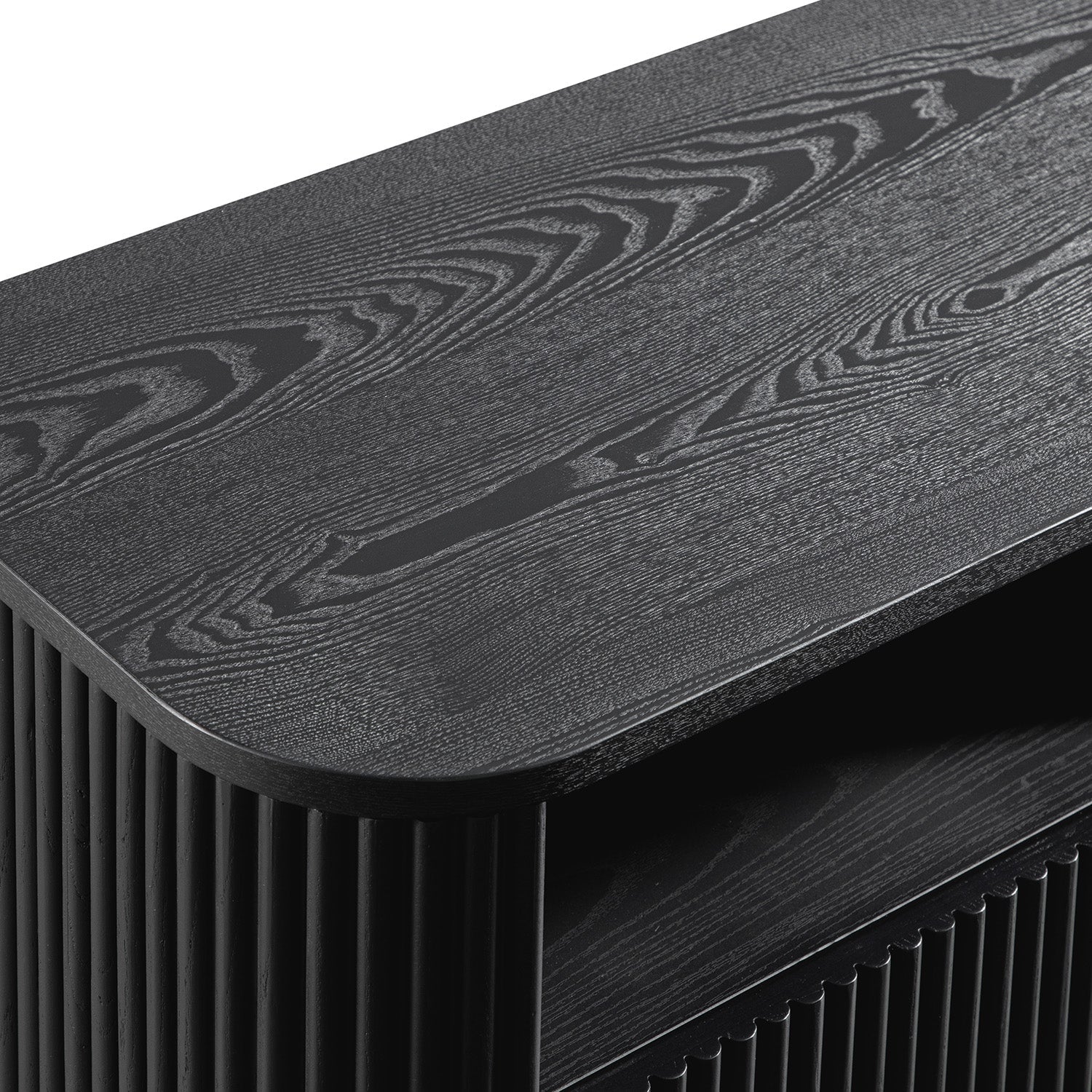 - Defined by its sculptural curves and fluted texture, this compact media unit brings together functional storage with sleek, architectural lines.