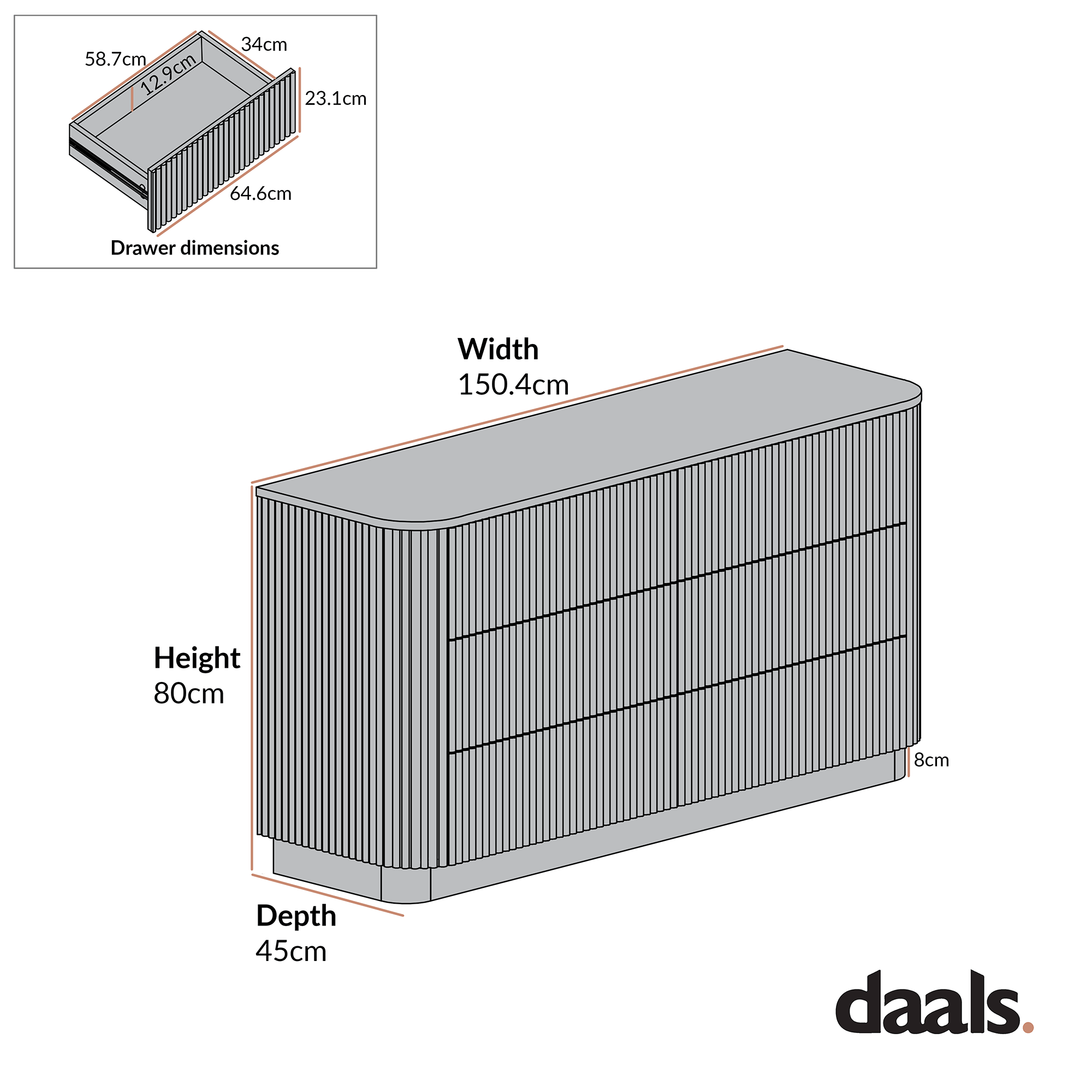 - Spanning 150 cm in width, this chest of drawer anchors the room with scale and serenity.