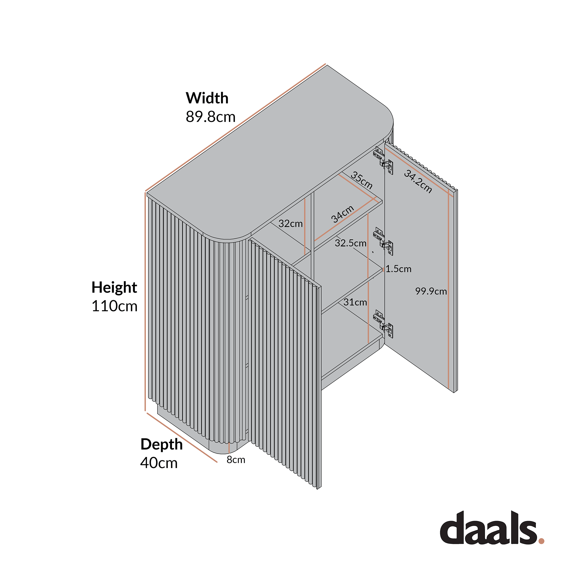 - The cabinet features all solid ash flutes on 3 vertical surfaces, while the recessed plinth base offers subtle lift.